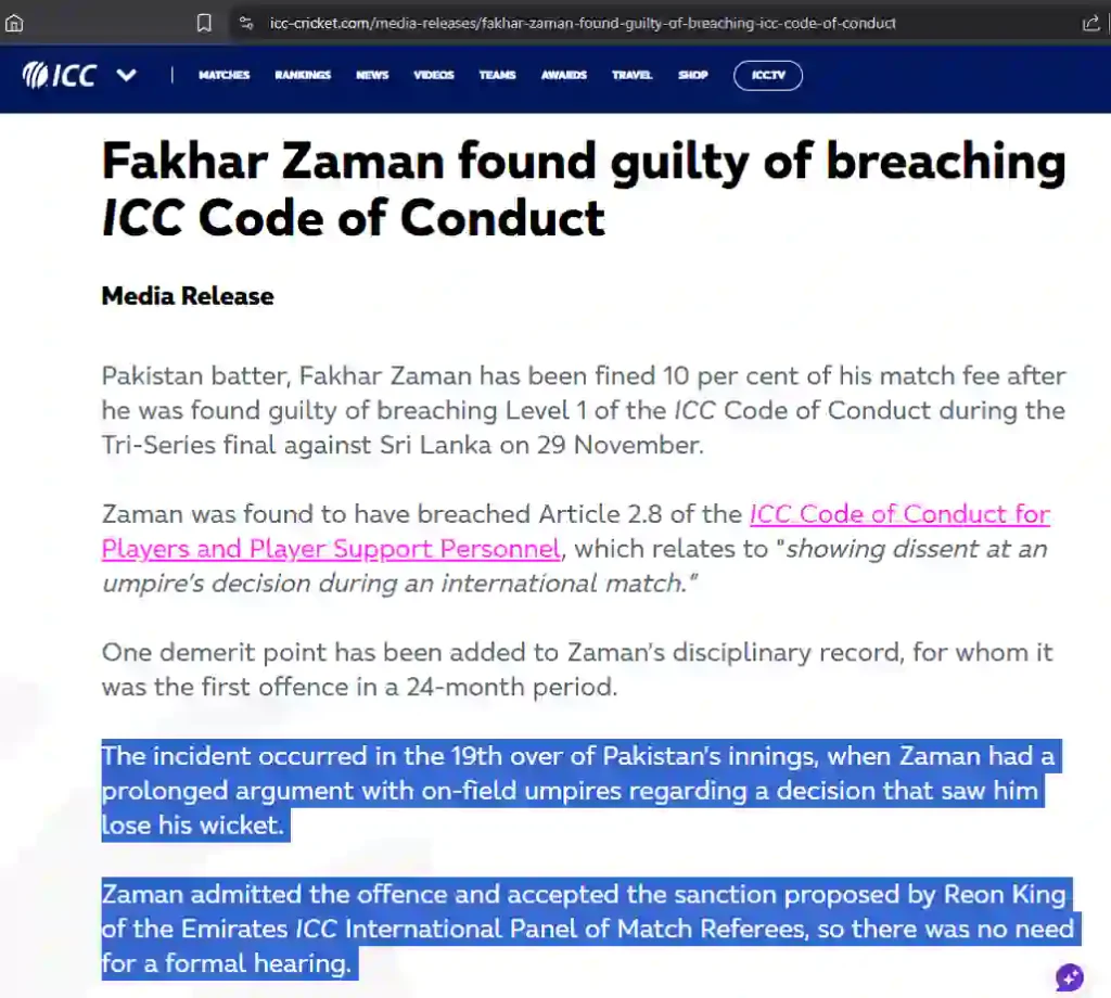 The ICC stated that Zaman breached the Code of Conduct by showing dissent after losing his wicket, but multiple match reports and footage confirm that the player’s actions occurred while fielding during Sri Lanka’s innings, not during his own dismissal.