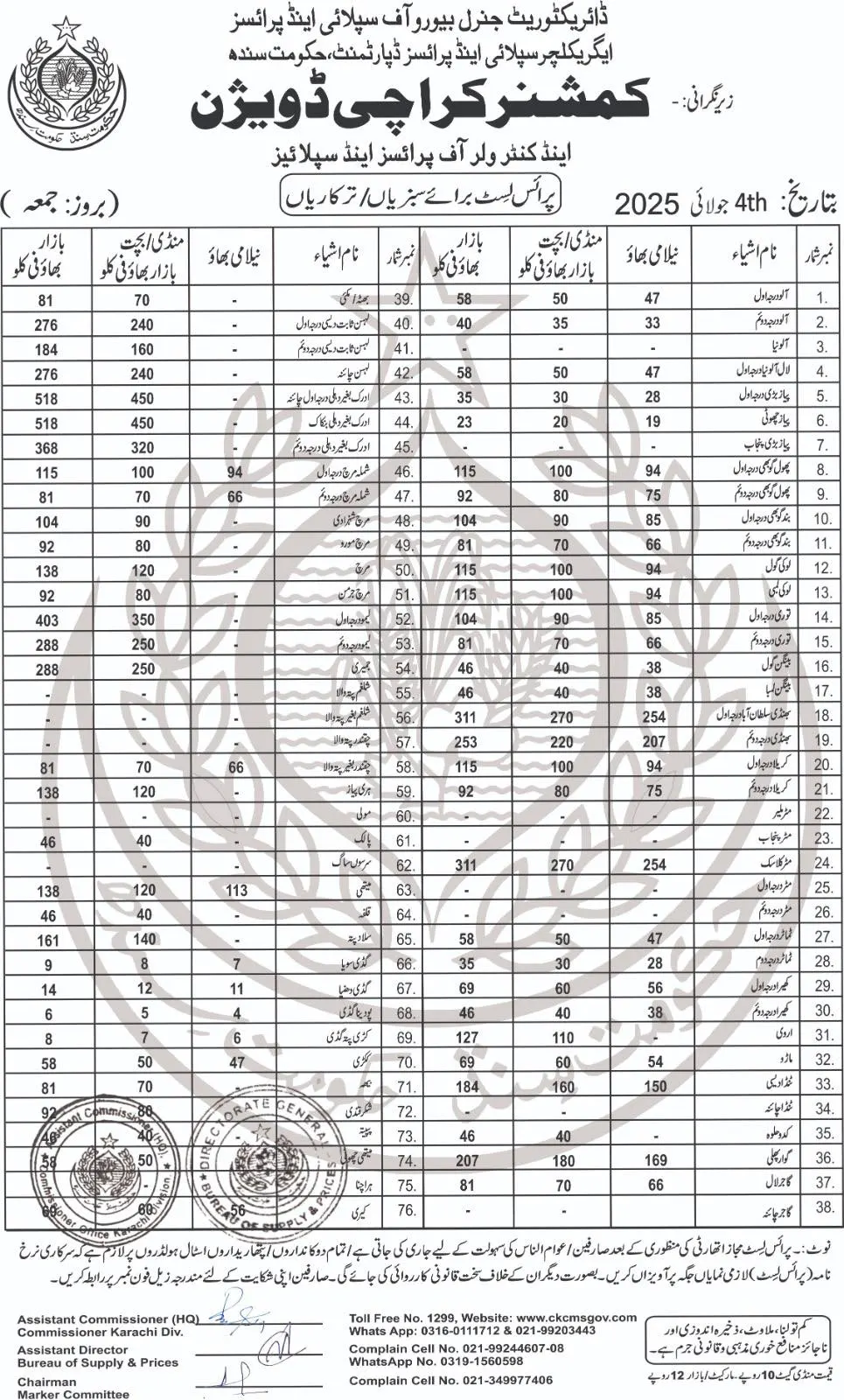 Commissioner Karachi Office has officially set Vegetable prices across the city for July 04, 2025, under Section 7 of the Sindh Essential Commodities Price Control and Prevention of Profiteering and Hoarding Act, 2005 (amended in 2008 and 2023).