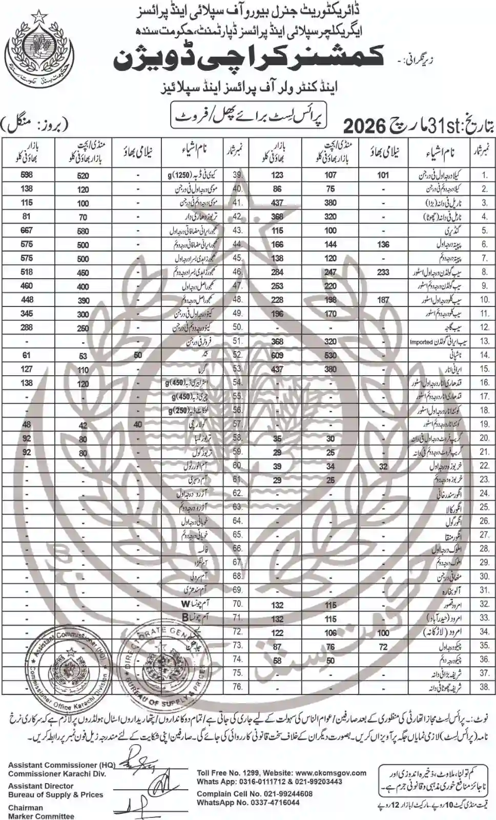 Commissioner Karachi Office has officially set Fruit prices across the city for March 31, 2026, under Section 7 of the Sindh Essential Commodities Price Control and Prevention of Profiteering and Hoarding Act, 2005 (amended in 2008 and 2023).