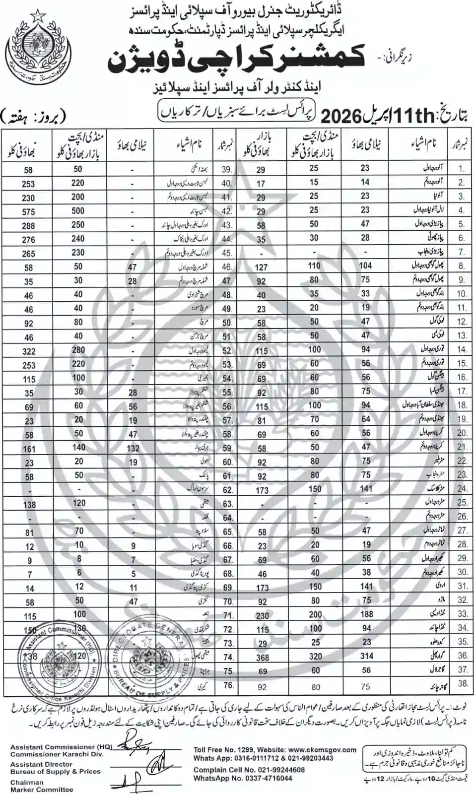 Commissioner Karachi Office has officially set Vegetable prices across the city for April 11, 2026, under Section 7 of the Sindh Essential Commodities Price Control and Prevention of Profiteering and Hoarding Act, 2005 (amended in 2008 and 2023).