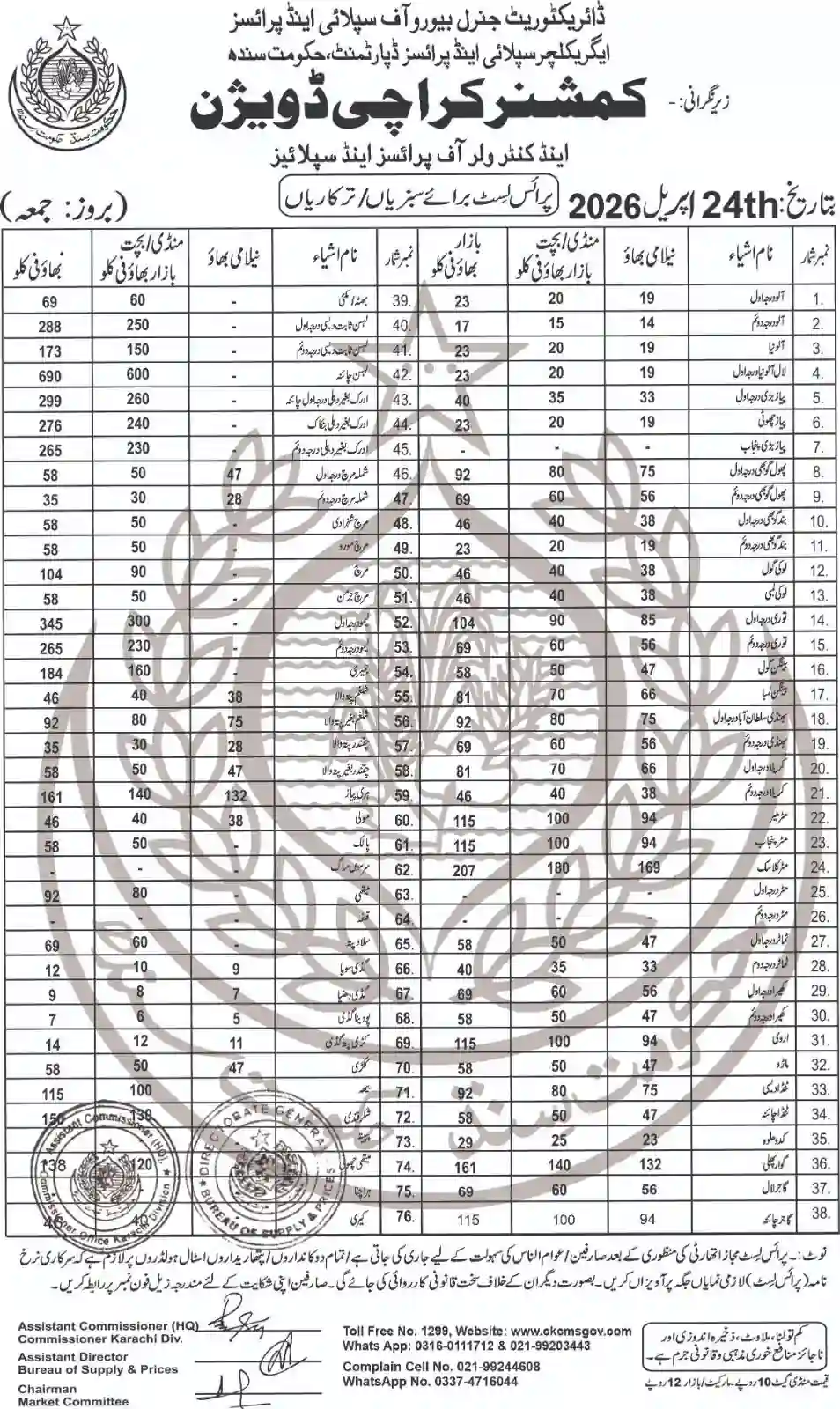 Commissioner Karachi Office has officially set Vegetable prices across the city for April 24, 2026, under Section 7 of the Sindh Essential Commodities Price Control and Prevention of Profiteering and Hoarding Act, 2005 (amended in 2008 and 2023).